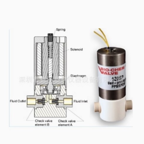微量泵为一种电磁驱动设备,是设计用于提供可重复和独立配送的流量。 弹性隔膜把流体通道与执行机构隔离开来。线圈通电时,隔膜被向后拉,在泵体内产生部分真空。这样就吸引液体通过入口单向阀(A),并同时关闭出口单向阀(B)。线圈断电时,弹簧把隔膜往下推,促使分离的液量通过单向阀B,并同时关闭单向阀A。对于每次独立配送,百柯流体公司的电磁微量泵需要进行一次完整的开关循环(参看下面)。线圈反复循环运动可产生脉动流。