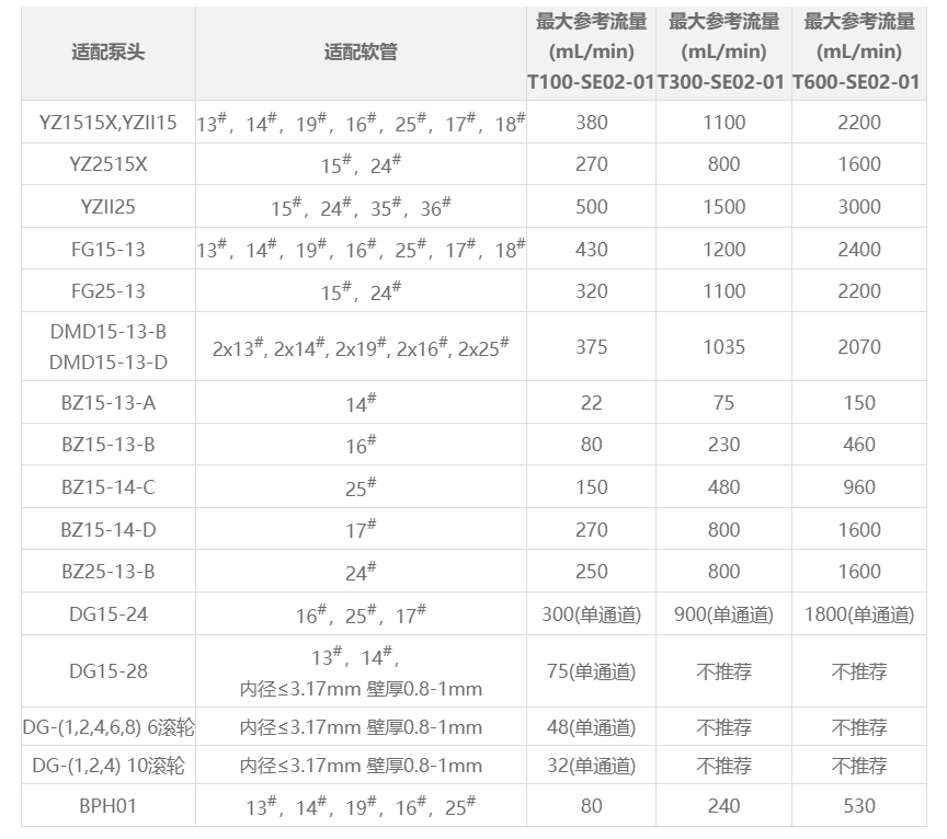 适配泵头软管及流量 |