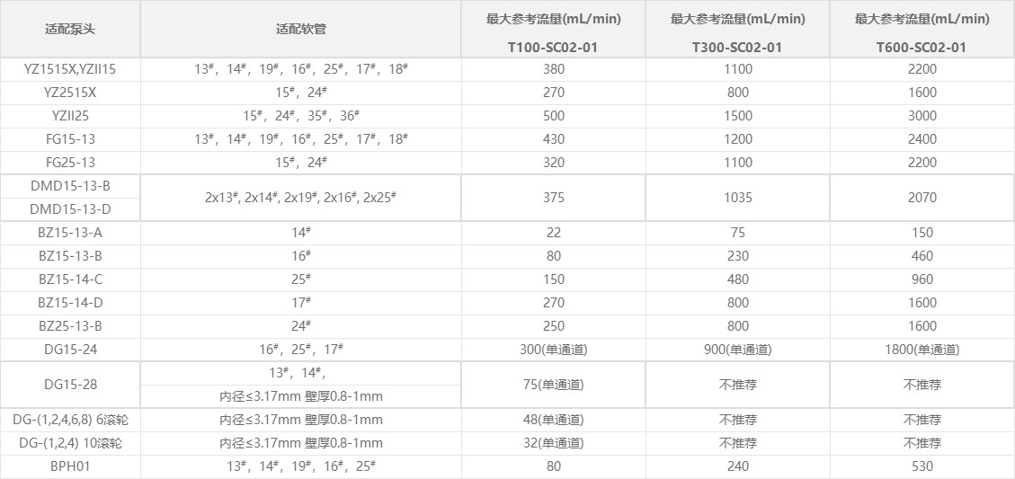 | T100-SC02-01 | T300-SC02-01 | T600-SC02-01 | 转速范围 | 0-100rpm | 0-300rpm | 0-600rpm | 控制分辨率 | 0.1rpm | 1rpm | 1rpm | 控制功能 | 通过通信指令控制泵的转速、启停、方向和全速状态。泵的上电运行状态可设。RS485接口,支持Modbus RTU协议和兰格OEM协议 | 通信控制参数 | 波特率:1200bps, 9600bps, 19200bps, 115200bps 校验位:无校验或偶校验 通信地址:1-32 停止位:1位停止位 | 输出功能 | DC5V 100mA | 适配电源要求 | DC24V/15W | DC24V/45W | DC24V/55W | 外形尺寸(L*W*H) | 121x102x118(mm) | 143x102x118(mm) | 安装方式 | 支持面板安装或者底板安装 | 工作环境参数 | 温度0℃-40℃,湿度<80% | 产品重量(不含泵头) | 1.29kg | 1.61kg |