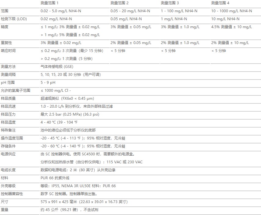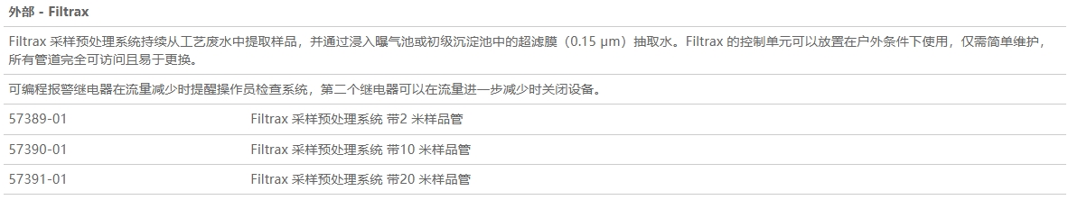 | 分析仪 | | LXV461.99.00311 | NH6000sc 氨氮分析仪,1 通道,用于 1 个外部样品过滤系统,流量检测,自动验证抓取样品,230 VAC | | LXV461.99.01311 | NH6000sc 氨氮分析仪,1 通道,包括集成样品供应泵,用于 FX610 样品过滤系统,流量检测,自动抓取样品验证,230 VAC | | LXV461.99.02311 | NH6000sc 氨氮分析仪,1 通道,包括样品供应泵,用于 FX620 样品过滤系统,流量检测,自动验证抓取样品,230 VAC | | 请注意:这些是常见的产品配置,更多配置选型请联系哈希公司中国各办事处。 | | NH6000sc 的操作需要样品过滤系统(Filtrax 或 FX6x0)和数字 Hach SC 控制器。样品过滤系统和控制器单独出售。 | | 安装硬件和配件 | | LZY285 | 用于 SC 分析仪的导轨安装套件(带 SC 控制器) | | LZY286 | 用于 SC 分析仪的支架安装套件(带 SC 控制器) | | LZY316 | 用于 SC 分析仪的导轨安装套件(不带 SC 控制器) | | LZY287 | 用于 SC 分析仪的支架安装套件(不带 SC 控制器) | | LXZ461.99.00007 | 控制器安装套件 | | LXZ461.99.00011 | 加热排水软管,5 米,230 V | | LXZ461.99.00003 | 用于多个分析仪的样品和连接管 | | LQV155.99.00002 | 电源盒(不带电源连接电缆) | | LQV155.99.00012 | 电源盒(带电源连接电缆) |